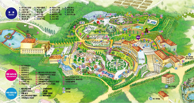 문을 지나 토스카나 광장이 펼쳐지면 이곳이 왜 ‘정원’이라는 이름을 붙였는지 바로 이해된다. 사계절 다른 표정을 가진 플로라 분수, 부드러운 곡선을 그리며 이어지는 경사 정원, 그리고 여러 나라의 정원을 차분하게 섞어놓은 듯한 조경이 방문객을 느리게 만든다.