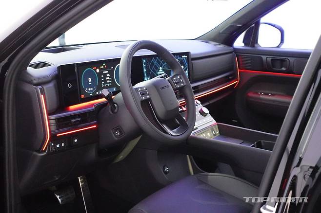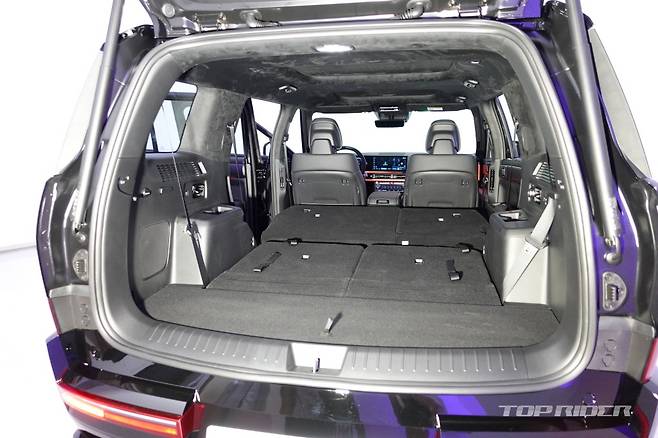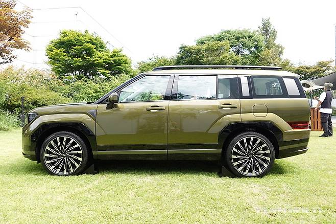 측면부는 짧아진 전면 오버행과 길어진 전장 및 휠베이스로 안정적인 프로포션이다. 쭉 뻗은 루프라인과 각진 형상의 윈도우, 최대 21인치 휠은 전형적인 오프로더 스타일이다. 특히 펜더 볼륨감은 현대차그룹 SUV 중 가장 좋다. 좌우 C필러에는 히든 어시스트 핸들이 배치됐다.