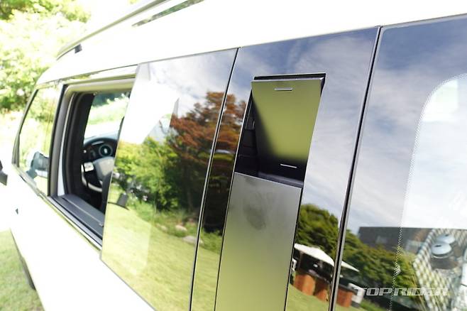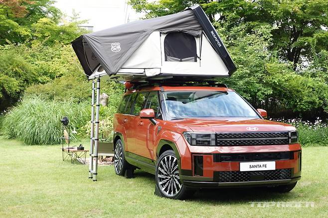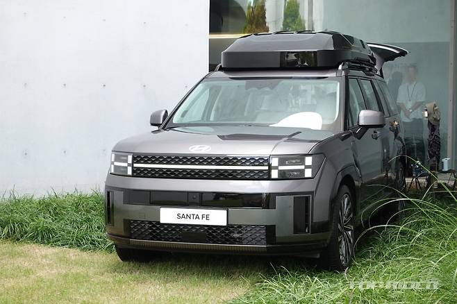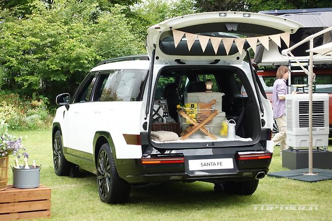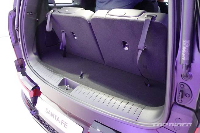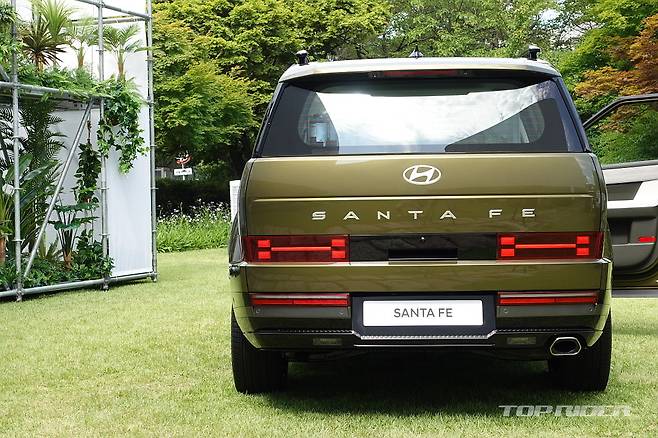 히든 어시스트 핸들은 루프랙 이용시 잡고 올라갈 수 있도록 돕는데, 사용하지 않을 때는 잠금을 걸어 둘 수 있다. 내부에는 배수구가 있어 물이 고일 일은 없어 보인다. 후면부에는 전면과 통일감을 주는 H 라이트, 대형 'SANTA FE' 레터링, 히든 와이퍼 등이 탑재됐다.
