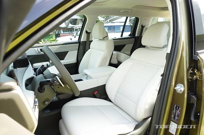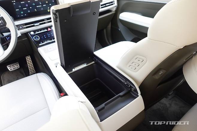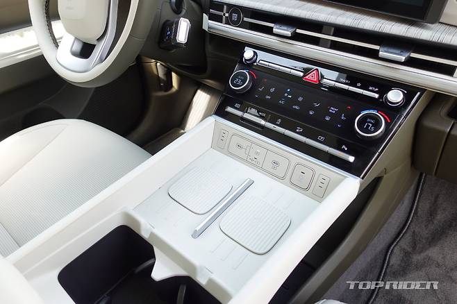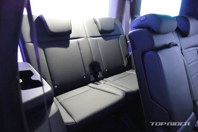 조수석 대시보드 상단에는 UV-C 자외선 살균 소독 멀티 트레이가 배치됐다. 신형 싼타페 실내 헤드룸 공간은 1열부터 3열까지 모두 여유롭다. 다만 키 180cm 남성 기준 3열 시트에 편하게 앉기에는 레그룸 공간이 다소 부족하다. 2열 레그룸 공간을 희생해야 앉을 수 있다.