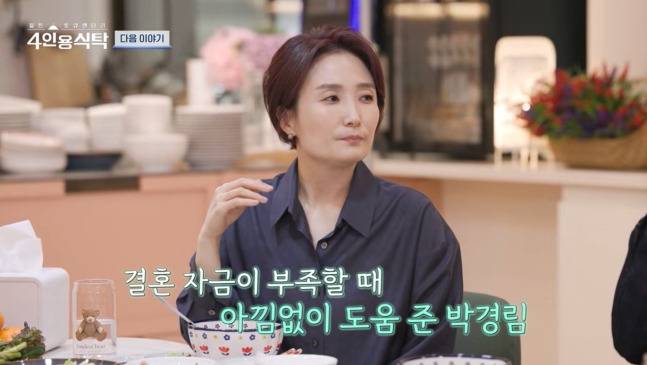 그는 "(남편이) '누나 참 좋은 분 같다, 좋은 분들과 일해서 좋다'라고 (문자를) 보내서 '저는 (남자로서) 좋아한다'라고 했다"라고 말했습니다. 또 "결혼 자금이 모자랄 때 (경림) 언니랑 수영 언니도 돈도 엄청 많이 해주셨다"라고 고마워했습니다.