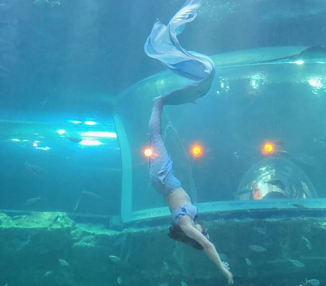 메인 수조에서 진행되는 '수중 홀로그램: 소녀의 인어수업' 공연은 인어가 되기를 꿈꾸는 소녀의 이야기를 아름답게 그려내며, 하루 7차례에 걸쳐 진행돼 방문객 누구나 즐길 수 있습니다.