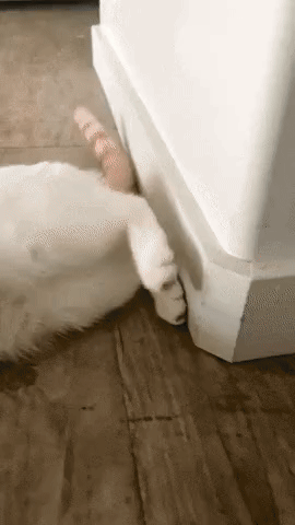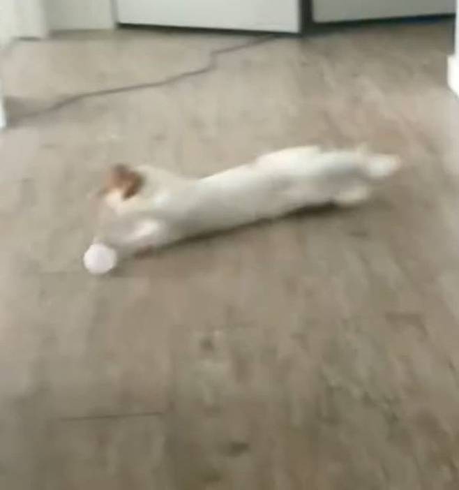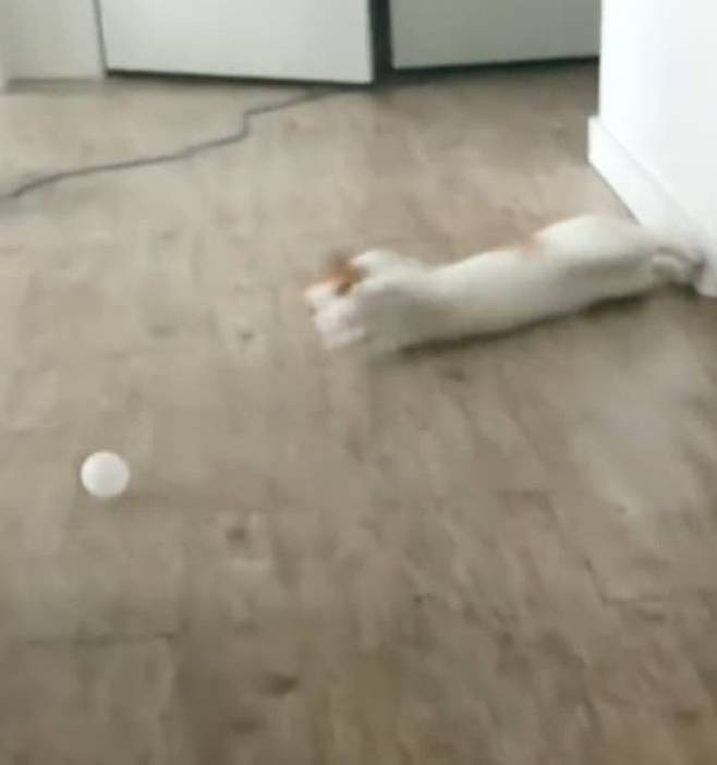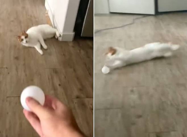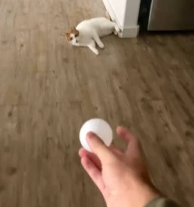 이날 그는 바닥에 누워 있는 고양이를 향해 장난기가 발동, 공을 던져 보기로 합니다. 그러자 놀라운 일이 벌어졌죠.