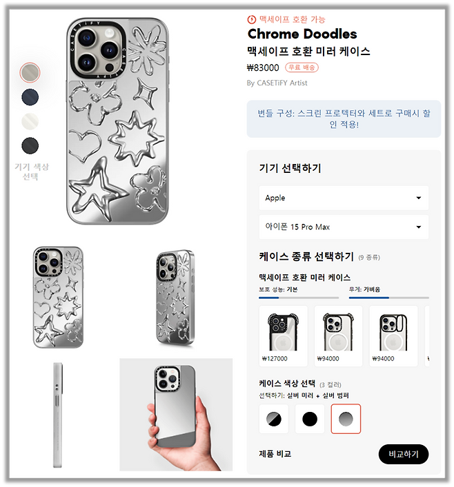 이렇게 다양한 디자인의 제품들을 소비자에게 제공하면 자칫 브랜드만의 정체성을 잃어버리기 쉽잖아? 케이스티파이는 ‘누가 봐도 케이스티파이 케이스다’라는 것을 알 수 있도록 후면 카메라의 링 디자인을 통일했어. 블랙 컬러의 카메라 모서리를 감싸는 범퍼에 화이트 컬러의 케이스티파이 로고가 음각으로 새겨진 디자인으로 케이스티파이의 시그니처야. 단순한 디자인 포인트지만 사람들에게 케이스티파이라는 브랜드를 각인시키는 데 효과적이었어!
