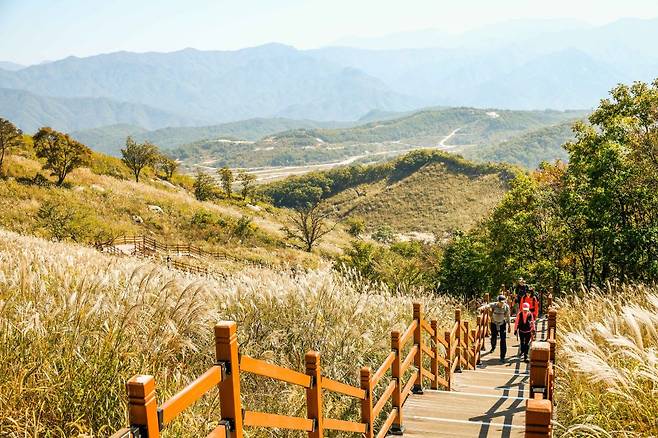 가을 햇살에 반짝이는 억새를 만나기까지, 오르막길은 결코 쉽지 않다. 그러나 그 노력의 보상은 확실하므로 걱정하지 않아도 된다. 정상부에 오르면 사방으로 펼쳐지는 억새 군락이 산 능선을 따라 이어지고, 바람이 불 때마다 황금빛 파도가 일렁인다.