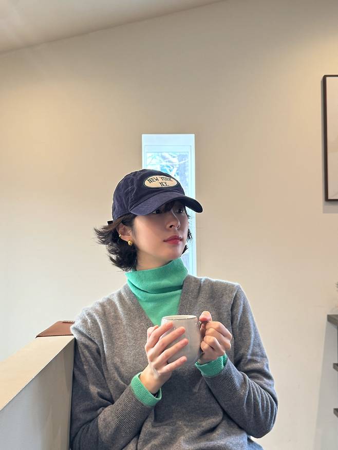 가디건 소매 밖으로 살짝 비져나온 터틀넥의 디테일과 골드 컬러의 손목시계, 그리고 앙증맞은 이어커프까지 더해져 '꾸안꾸' 패션의 정석을 보여주고 있어요.