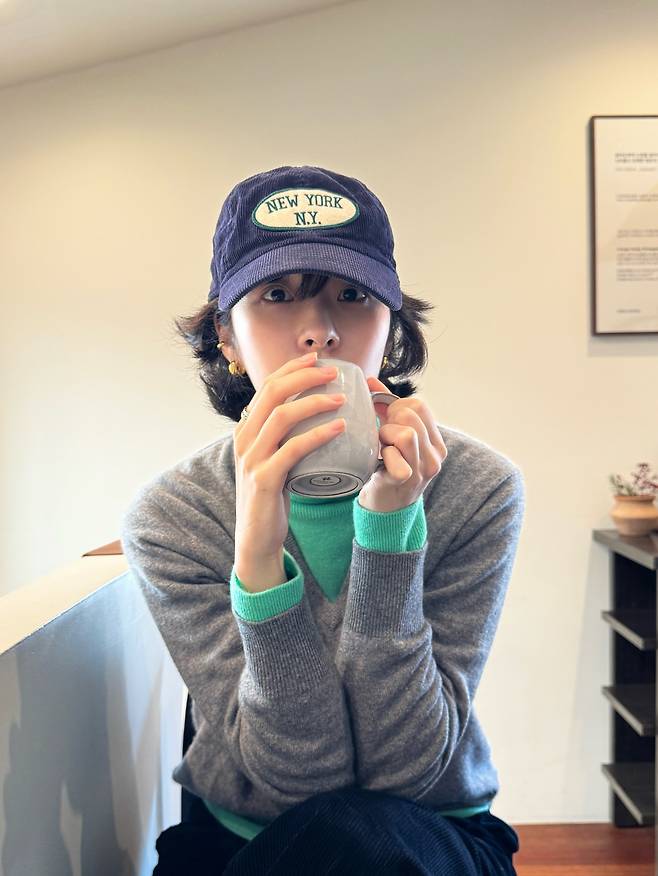 자칫 단조로울 수 있는 그레이 브이넥 가디건 안에 선명한 컬러감을 더해 얼굴색을 화사하게 밝혀주는 반전 효과를 줬네요.