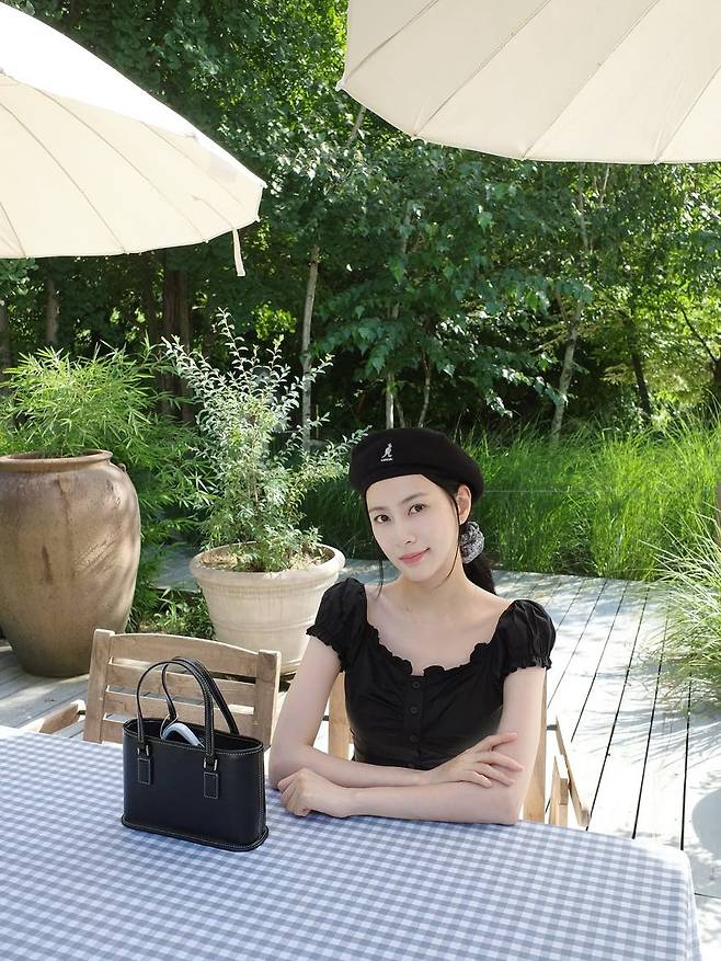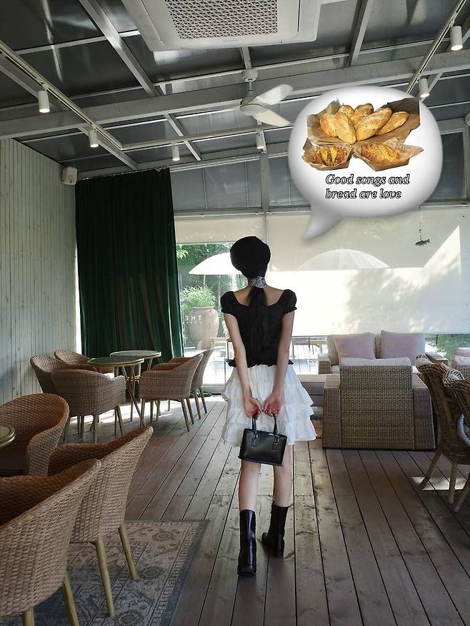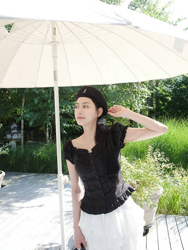 카페 테라스 위 체크 테이블, 따사로운 여름 햇살 사이로 오하영이 모습을 드러냈다. "좋은 노래와 빵은 사랑이야"라는 멘트처럼, 그녀의 차분하면서도 사랑스러운 분위기가 프렌치 감성 가득한 룩에 그대로 녹아들었다. 블랙 블라우스와 베레모, 가죽 미니백의 조합은 클래식하면서도 경쾌한 인상을 준다.