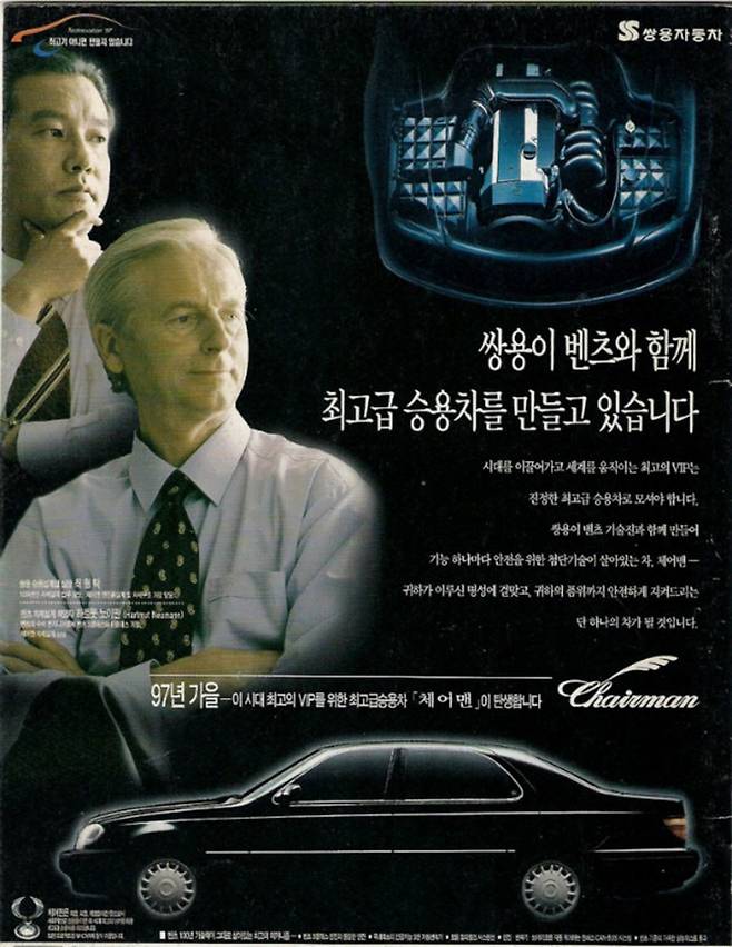 1997년 등장한 쌍용자동차 체어맨은 국산 최초의 정통 고급 세단이자, 쌍용차의 첫 승용차였다. 개발에는 약 4,500억 원이 투입됐으며, 당시 제휴 관계였던 메르세데스-벤츠의 플랫폼과 엔진을 그대로 가져와 완성도를 높였다. 기반은 벤츠 W124, 디자인은 W140 S클래스를 연상케 할 정도였다. 파워트레인은 벤츠의 직렬 4기통 2.3L, 직렬 6기통 2.8L·3.2L 엔진이 적용됐고, 각종 안전·편의 사양도 당대 최고 수준이었다.