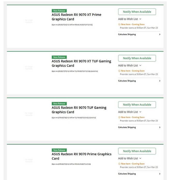 이를 뒷받침하는 소식이 등장했습니다. B&H Photo Video 매장에서 AMD 라데온 RX 9070 그래픽카드를 3월 23일부터 선주문 받는다는 정보가 나왔기 때문이죠. 매장에서는 에이수스 터프 게이밍(Tuf Gaming) 2개와 프라임(Prime) 제품 2개 등 총 4개 제품이 등록됐다고 합니다. 각각 라데온 RX 9070 XT와 라데온 RX 9070입니다. 지포스 RTX 5090과 RTX 5080이 2월 중에는 대부분 시장에 출시될 예정이기에 3월 출시는 조금 늦은 감이 있어 보입니다.