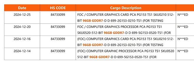 ComputerBase 정보에 따르면 수출입 목록 중 고사양 그래픽카드 리스트가 있었다고 합니다. ‘GRAPHICS CARD PCA PG153 TS1 SKU0210’으로 나와 있는데 블랙웰로 추정된다고 합니다. 놀라운 것은 사양인데요. 512비트에 96GB라고 되어 있습니다. 지포스 RTX 5090이 512비트에 32GB 용량 구성이니까 무려 3배 많은 용량을 제공하는 셈이죠. 만약 메모리 모듈 수가 동일하다면 모듈당 용량이 크게 증가했음을 암시하는 부분입니다. 아니면 모듈당 용량도 늘고 기판에 모듈을 양쪽으로 배치하는 식으로 증가됐을 가능성도 있습니다.