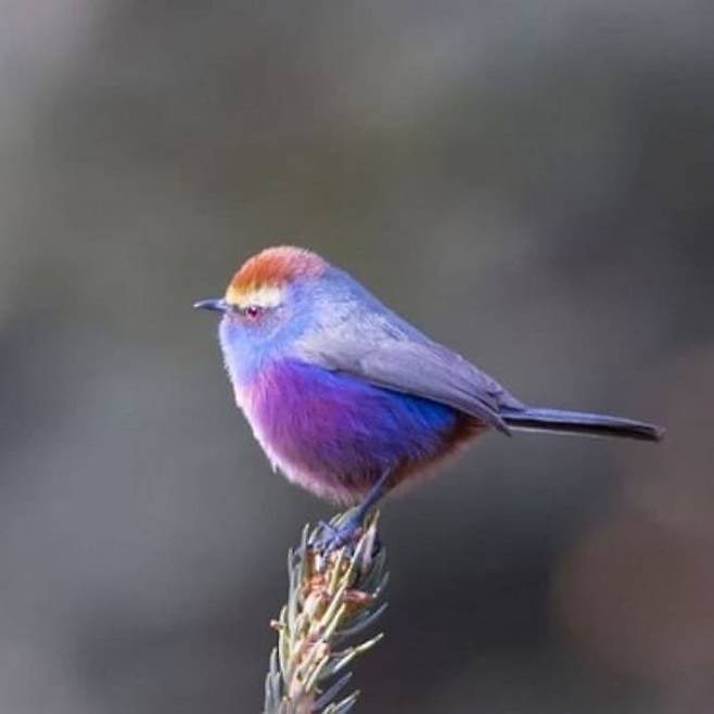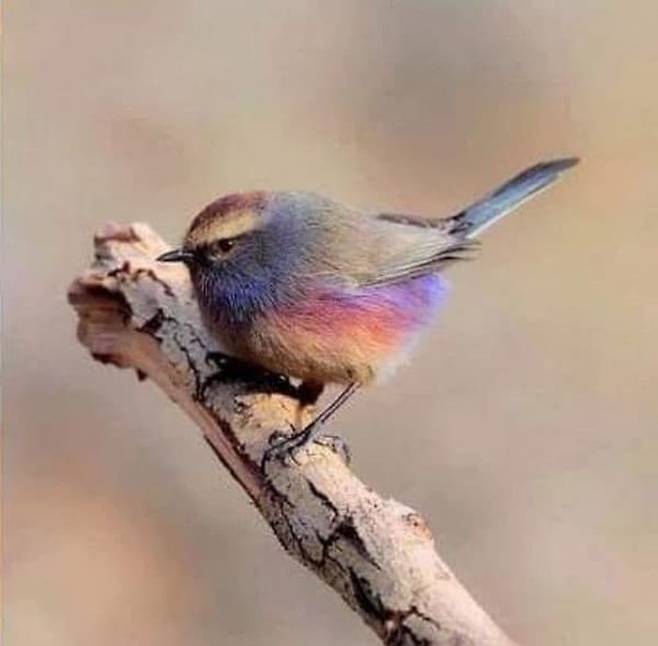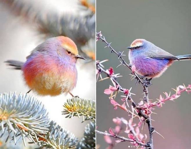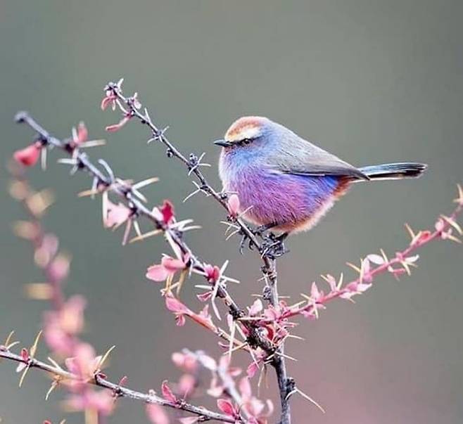 파스텔로 직접 색칠이라도 한 것 마냥 깃털 색깔이 화려하면서도 파스텔톤을 자랑하는 이 새의 이름은 '화채작앵(White-browed tit-warbler)'이라고 합니다.