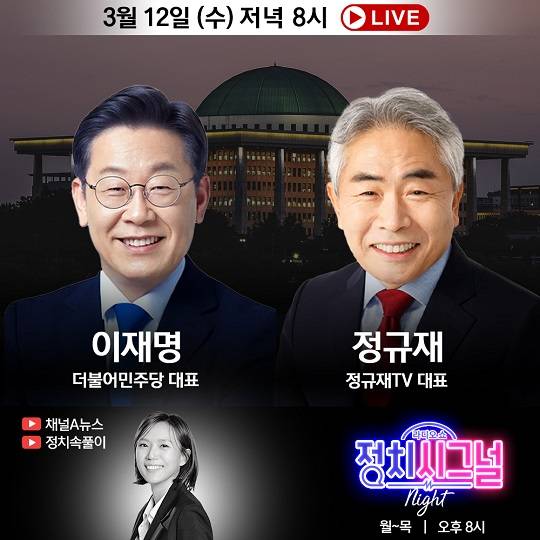 이재명 더불어민주당 대표가 오늘(12일) 밤 8시부터 55분간 채널A 유튜브 정치시그널 나이트 '대한민국 위기, 해법은?'에 출연합니다.
