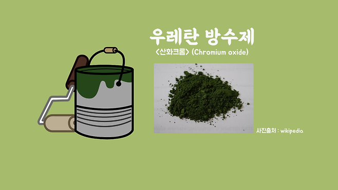 방수 페인트에는 우레탄 방수제라는 것을 사용합니다. 이 우레탄 방수제에는 산화크롬(chromium oxide)이라는 물질이 들어가는데, 위의 사진처럼 짙은 녹색입니다. 이것 때문에 방수 페인트의 색도 초록색이고, 색상 변경 없이 그대로 사용하다 보니 초록색의 옥상이 많은 편입니다.