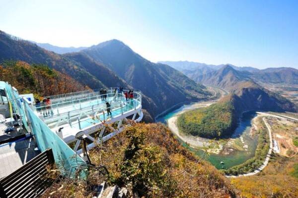 병방치 짚와이어와 함께 꼭 경험해야 할 곳이 바로 스카이워크입니다. 해발 583m 절벽 끝에 설치된 U자형 유리 전망대는, 발 아래로 한반도 지형의 밤섬과 동강의 절경이 한눈에 들어오는 곳입니다.