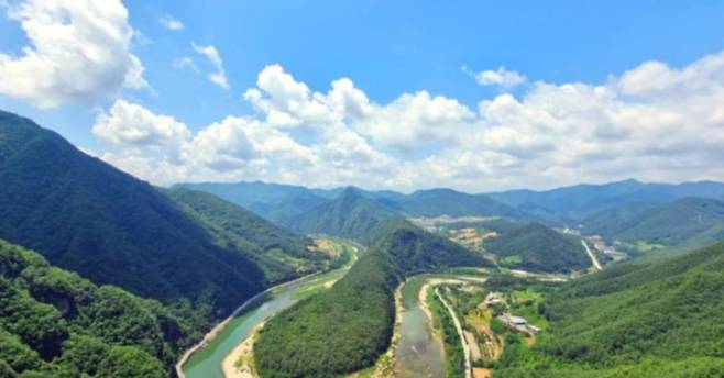 동강은 한반도 지형을 닮은 밤섬을 감싸며 S자 곡류를 이루고, 그 위를 가로지르는 짚와이어는 마치 자연 속을 나는 새가 된 듯한 기분을 선사하지요.