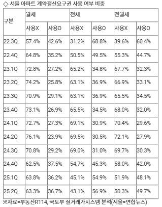 올해 2분기 서울 아파트 전월세 갱신계약 가운데 갱신권을 사용한 비중은 49.7%로 절반에 육박했다. 이는 2022년 3분기 60.4% 이후 최대 비중이다.