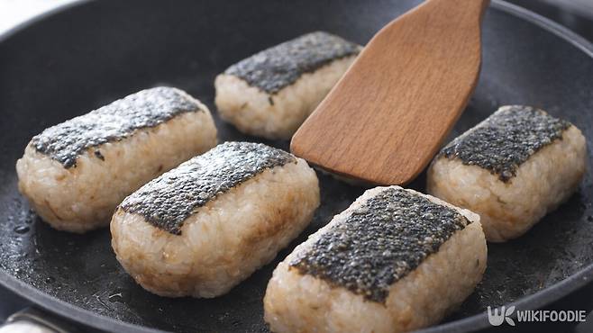 팬에 식용유를 두르고 달군 뒤 주먹밥을 하나씩 올린다. 위에서 가볍게 눌러 형태를 잡아주고, 앞뒤로 천천히 굽는다. 옆면도 세워가며 고르게 익힌다. 겉면이 노릇해지면 불에서 내린다.
