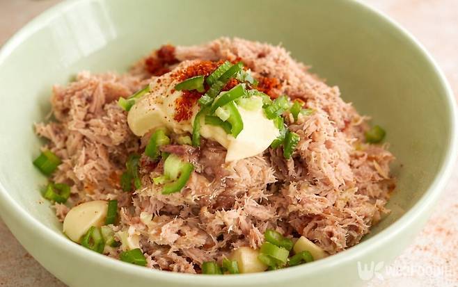 다 구운 대파와 참치를 큰 그릇에 넣어준 후, 마요네즈는 1큰술만 넣는다. 양을 늘리지 않아도 맛이 비지 않는다. 팬에서 구운 대파에서 나온 고소한 향이 부족한 부분을 채워준다. 여기에 올리고당 1큰술과 고춧가루 1/2큰술을 더하면 단맛과 매운맛이 과하지 않게 맞춰진다.