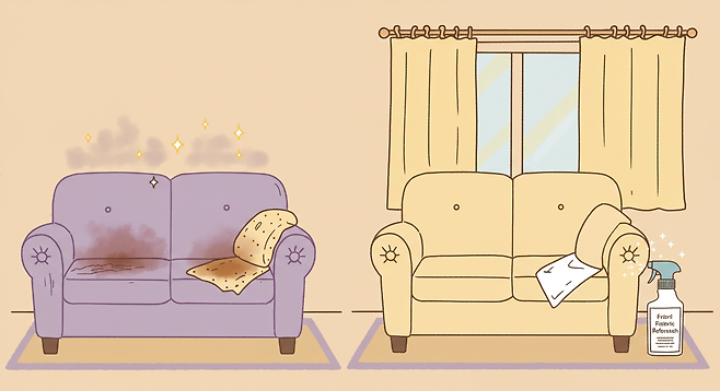 천 소재의 소파, 쿠션, 커튼, 러그 등은 실내 공기 중의 냄새를 흡수하는 성질이 있습니다.