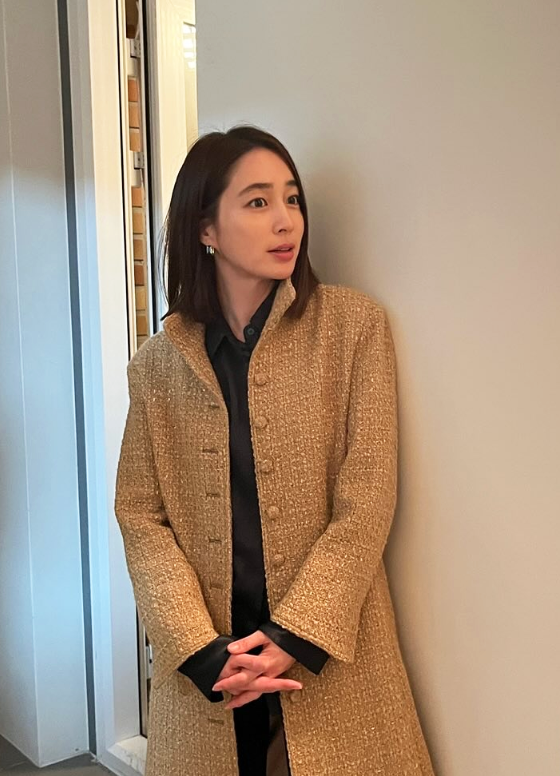이너로는 깔끔한 블랙 셔츠를 매치해 포멀한 분위기를 강조했으며, 차분한 톤의 메이크업과 단정한 헤어스타일이 전체 룩에 안정감을 더했다.