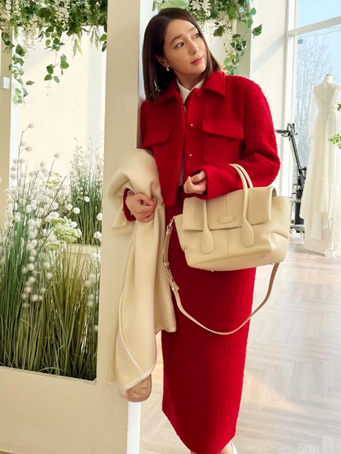 텍스처가 살아있는 레드 재킷과 스커트를 매치해 고급스러우면서도 에너지 넘치는 룩을 완성했으며, 여기에 밝은 아이보리 컬러의 코트와 토트백을 더해 따뜻하면서도 세련된 계절감을 살렸다.