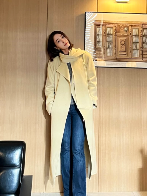 다른 사진에서는 밝은 크림 컬러의 롱 코트를 입고 세련된 겨울룩을 연출했다.