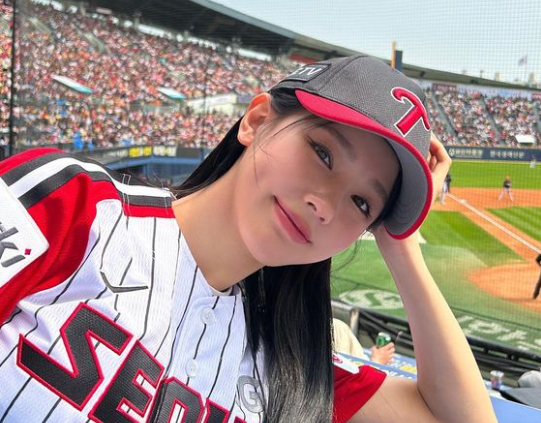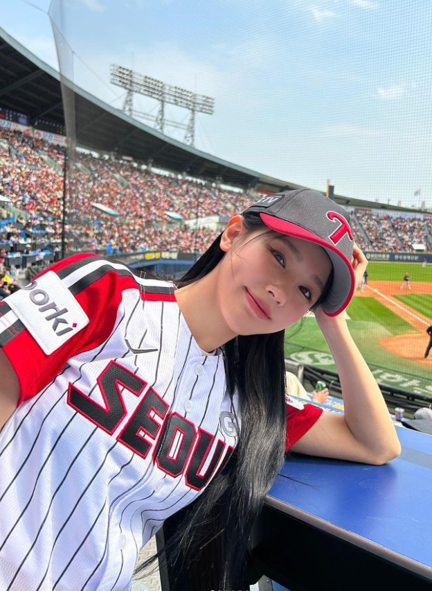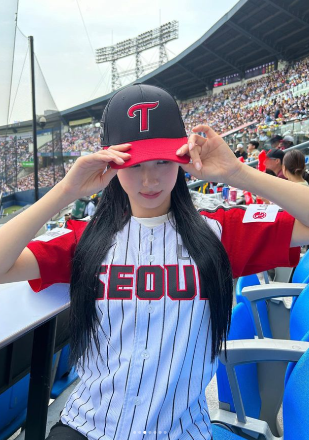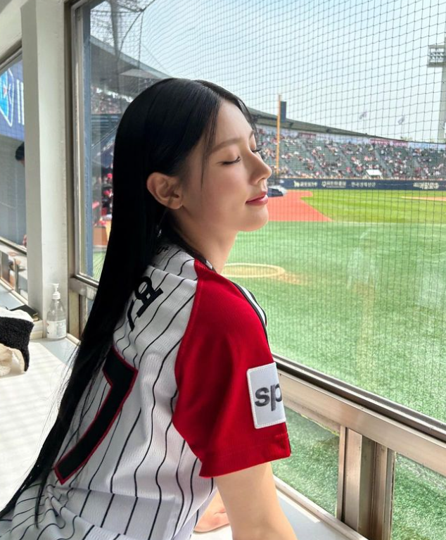 미연은 스트라이프에 붉은 색이 배색된 야구티를 입고 야구장에 등장했는데요.