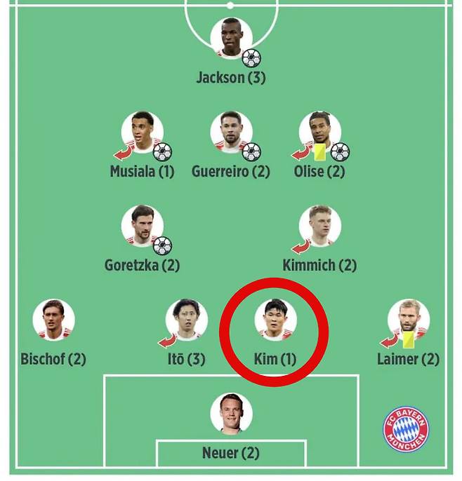 뮌헨은 4-2-3-1 전형을 사용했다. 마누엘 노이어가 골문을 지켰고, 톰 비쇼프, 이토 히로키, 김민재, 콘라트 라이머가 백4를 구축했다. 레온 고레츠카와 요주아 키미히가 허리를 받쳤고, 자말 무시알라, 하파엘 게헤이루, 마이클 올리세가 2선에서 최전방의 니콜라 잭슨과 함께 공격을 이끌었다.