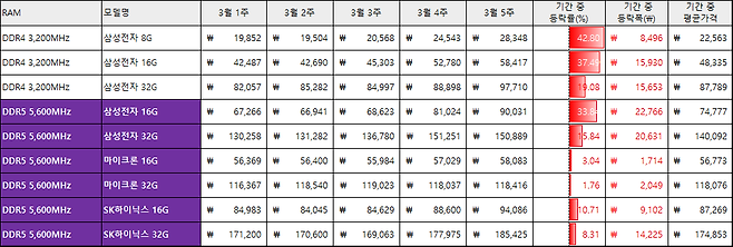 데이터 분석 기간(2025년 3월 1주차 ~ 3월 5주차) 동안 삼성전자 DDR5 5,600MHz 메모리의 평균 판매가격은 16GB(+33.84%), 32GB(+15.84%) 모두 가격이 대폭 올랐다.