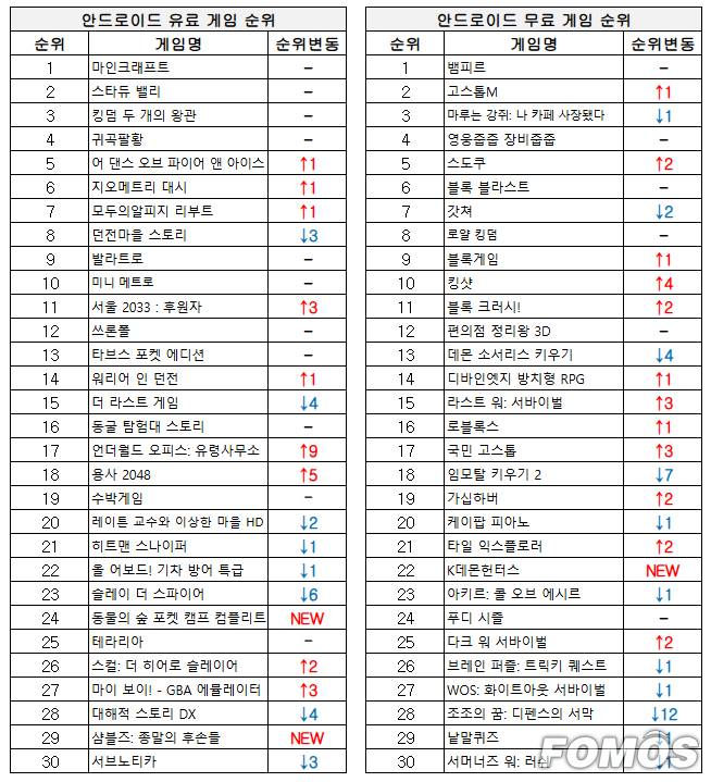 또, 지난주 중위권을 기록했던 캐주얼 게임의 순위가 상승한 모습을 보였다.