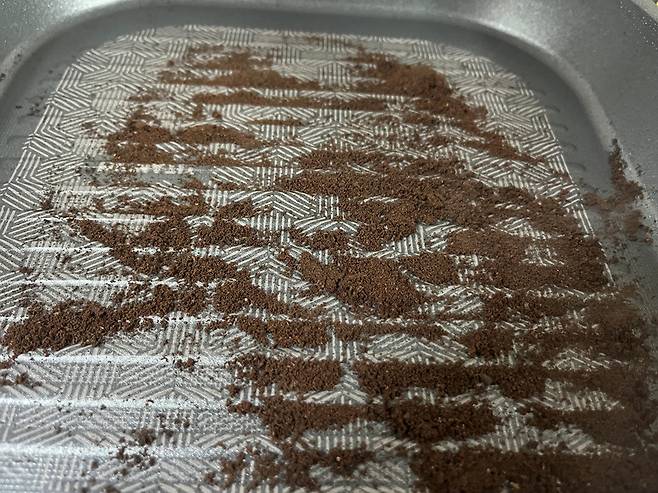키친 타월을 활용해 커피가루를 팬에 골고루 문지른 후 커피가루는 일반 쓰레기로 배출합니다. 커피 가루는 너무 마른 것보다는 약간 촉촉함이 남아 있는 것이 냄새 제거에 더 효과적입니다.