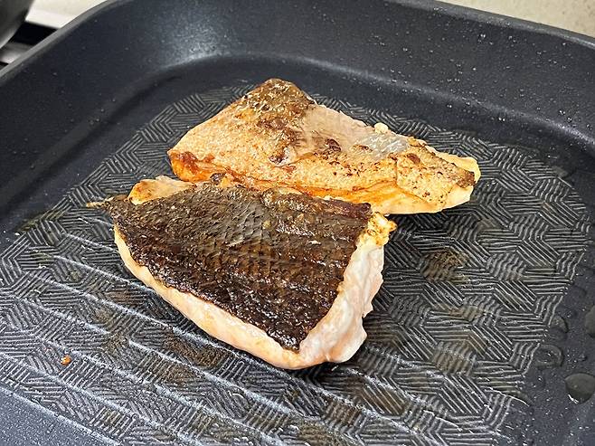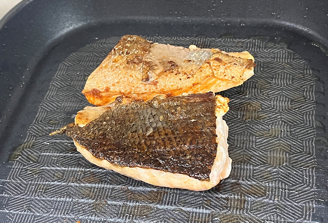 먼저 키친타월로 겉에 남은 기름을 깨끗하게 닦습니다. 생선도 은근히 지방이 있기 때문에 기름이 많이 나옵니다.