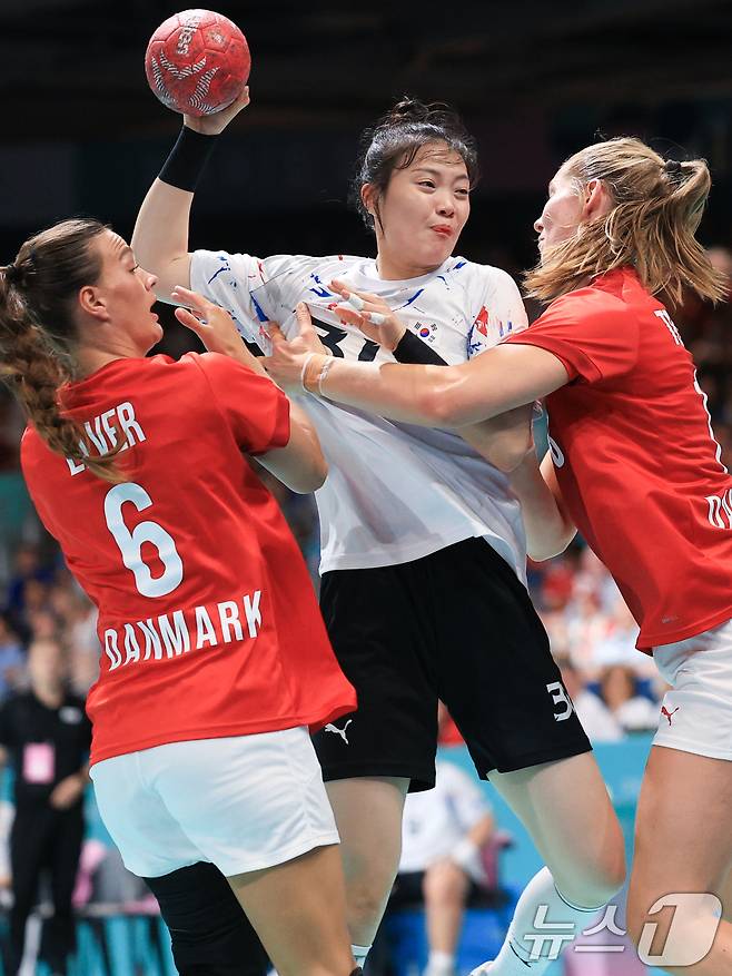 (파리(프랑스)=뉴스1) 박정호 기자 = 4일(한국시간) 프랑스 파리 사우스 파리 아레나6에서 열린 2024 파리올림픽 핸드볼 여자 예선 라운드 A조 대한민국과 덴마크의 경기에서 김보은이 슛을 시도하고 있다. 2024.8.4/뉴스1
