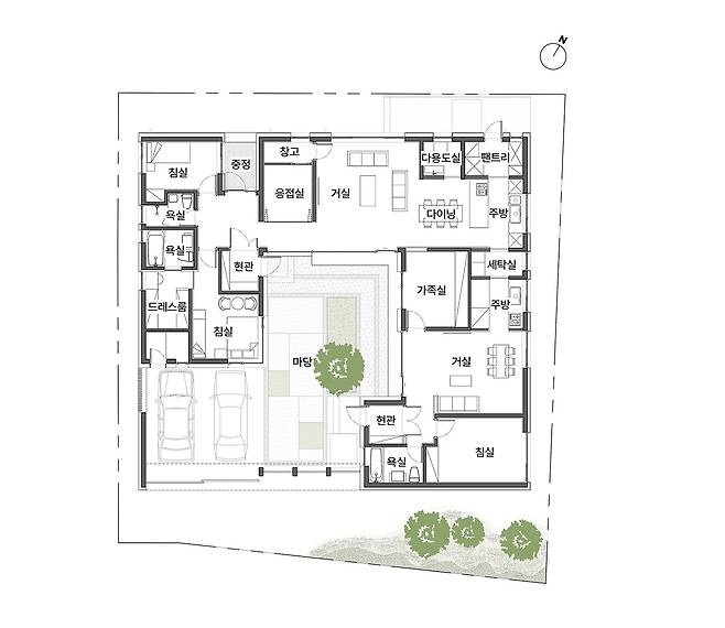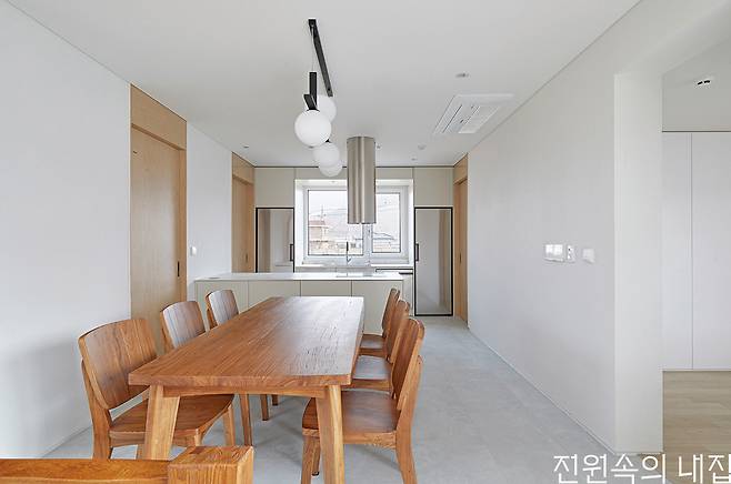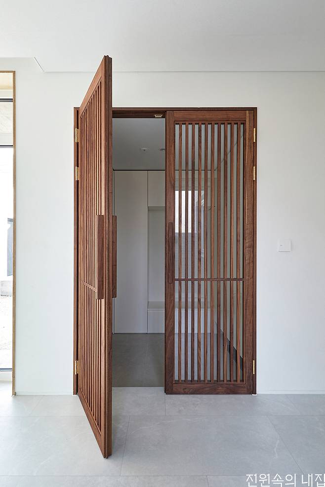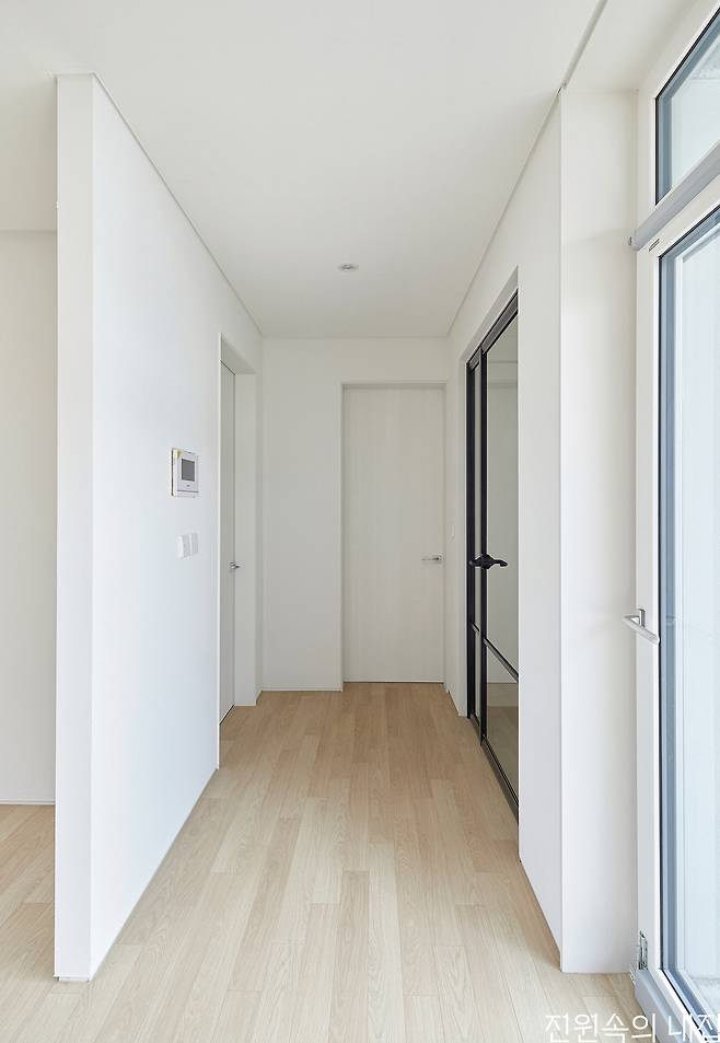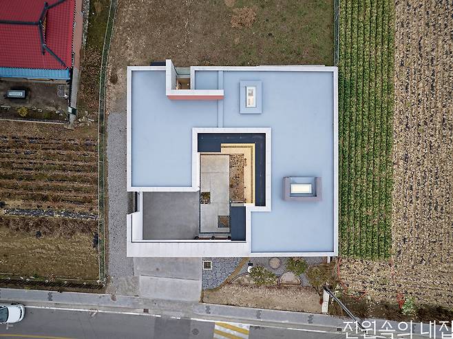 집은 부모님과 건축주의 생활 공간으로 나누어 구성되었다. 두 영역은 완전히 벽을 세워 나누기보다, 때에 따라 유동적으로 사용할 수 있도록 방문으로 구분해 주었다. 동시에 건축주가 새로운 가족을 꾸렸을 때도 네모난 집에서 함께 거주할 수 있게 독립적인 현관과 주방, 거실 등을 모두 갖추고 있다. 부모님의 공간은 두 분이 조금 더 편하게 생활할 수 있도록 침실과 화장실을 두 개씩 구성했다. 어머님은 집을 지으면서 세탁실과 다용도실, 팬트리 등 다양한 실의 구성을 원했다. 설계를 진행한 에스엠엑스엘건축사사무소는 이러한 요구사항을 반영할 때, 단층이지만 아파트처럼 공간들이 한 곳에 집약되지 않도록 배치에 중점을 두었다고 전했다.