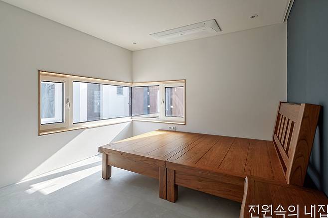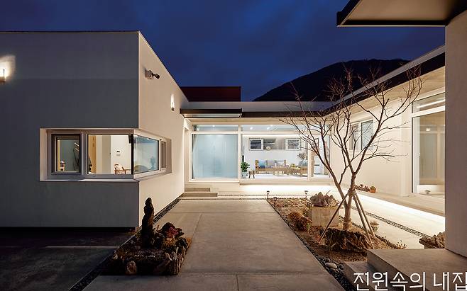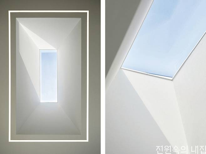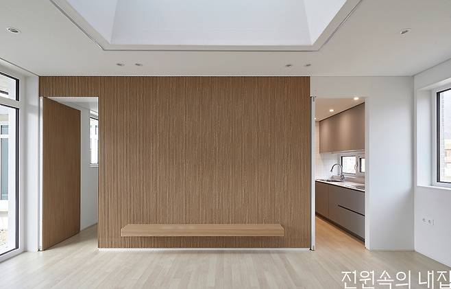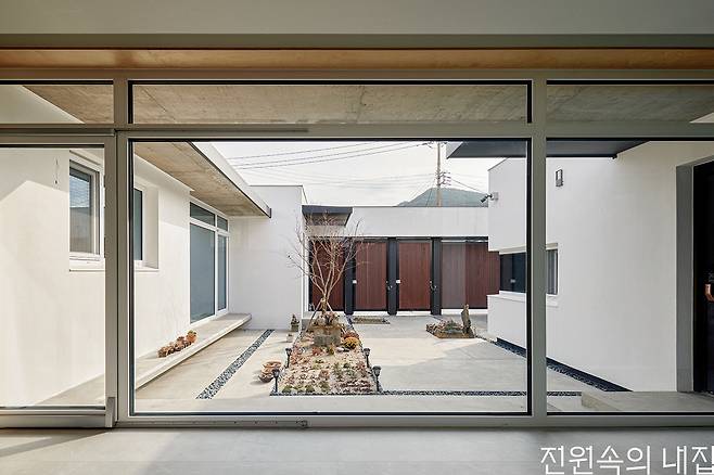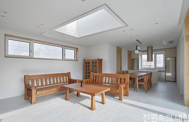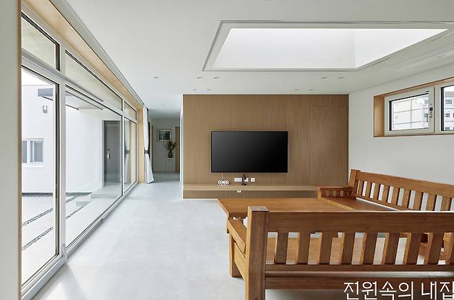 중앙 마당은 분리된 두 생활 공간의 연결 고리인 동시에 바깥으로 닫힌 집의 채광을 확보하는 역할을 한다. 각각의 거실 공간이 마당으로 연결되어 집 전체에 외부의 풍경을 담는다. 여기에 더해 두 거실에 모두 천창을 설치해 오랜 시간 집 안으로 햇살과 자연을 받아들일 수 있게 계획했다. 바깥으로는 최소한의 창만 배치했기 때문에 천창이 중요한 역할을 한다. 구조적으로 복잡한 부분이 없는 집이지만, 오픈 부위인 천창은 건축주가 설계적으로 신경 쓴 부분이기도 하다. 실내 인테리어는 밝고 아늑한 분위기를 조성하기 위해 전체적으로 화이트 톤을 전개하고 부분적으로 우드 톤을 가미했다. 거실의 아트월과 방문의 포인트들은 어머님의 취향이 반영된 가구 스타일링과 잘 맞아떨어져 통일성 있는 공간을 완성한다.