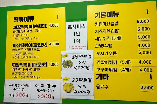 - 주요메뉴: 고추장 밀떡 떡볶이, 김말이튀김, 냉쫄면, 새우튀김 등