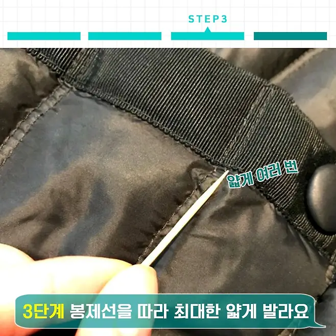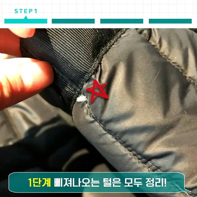 이렇게 빠져나오는 패딩 털들을 우선 다 정리해줘야 해요. 패딩 털이 빠져나올랑 말랑하는 부분은 가차 없이 모두 빼주세요.