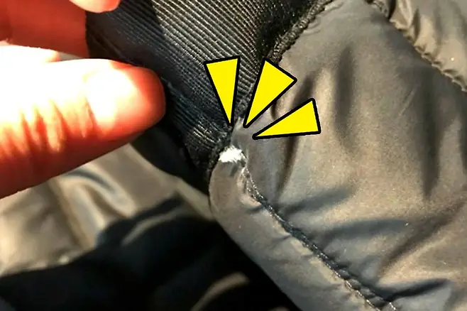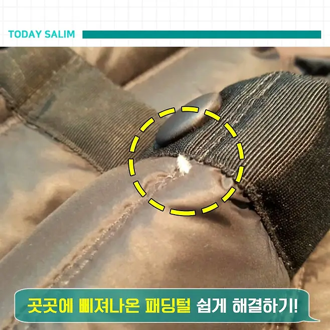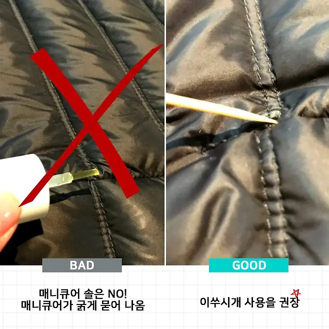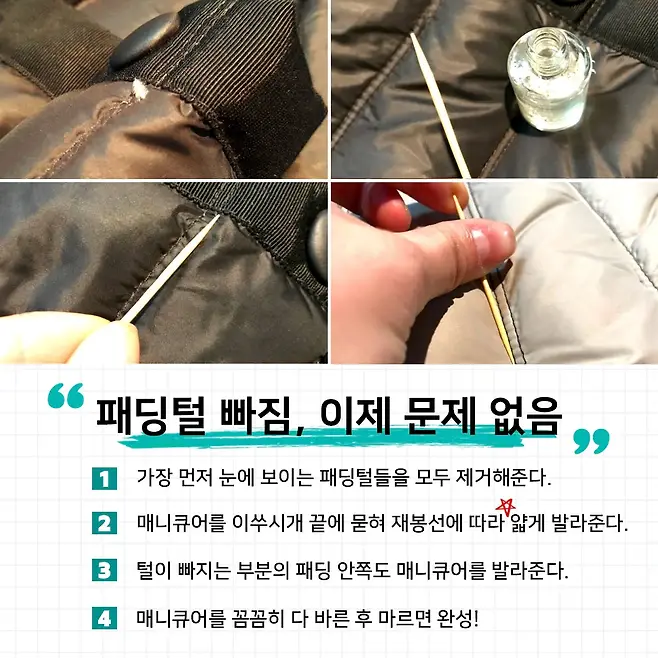 이렇게 바느질 봉제선의 틈에서 빠져나오는 오리 털, 거위털을 매니큐어로 해결을 할 수 있습니다. 이 방법으로 말이죠.