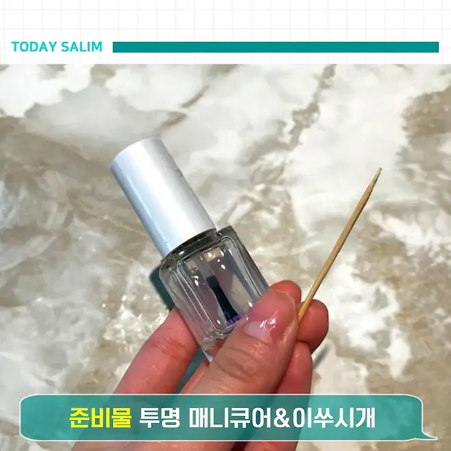 투명이지만 매니큐어 특유의 반짝임이 있어서 좀 우려스럽죠?! 그래서 이쑤시개가 필요해요.