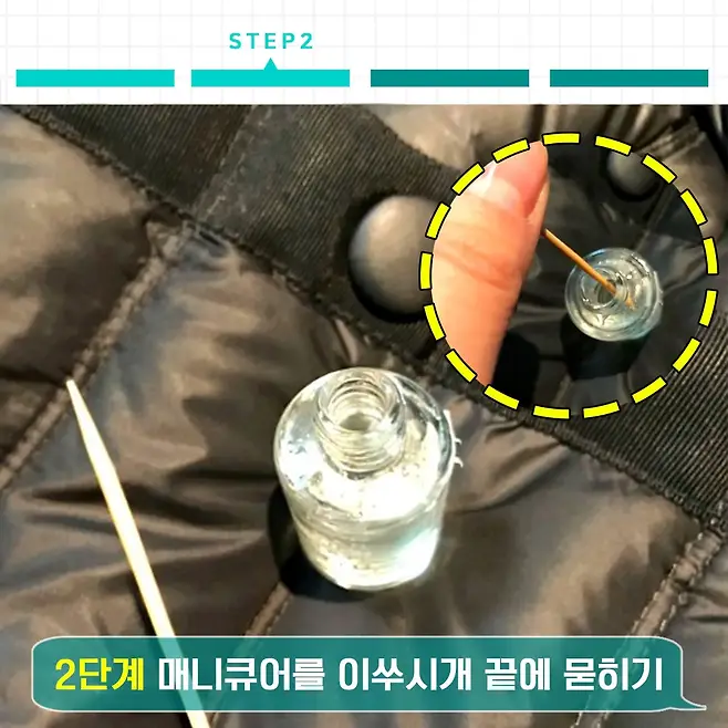 봉제선을 따라 최대한 얇게 투명 매니큐어를 발라주세요. 이때 이쑤시개를 사용하면 봉제선 밖으로 벗어나지 않고 얇게 바를 수 있습니다.