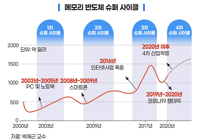 반도체 슈퍼 사이클은 PC, 스마트폰의 보급과 같이 전자기기의 기술 발전에 따라 반도체 수요가 폭발할 때 나타났습니다.