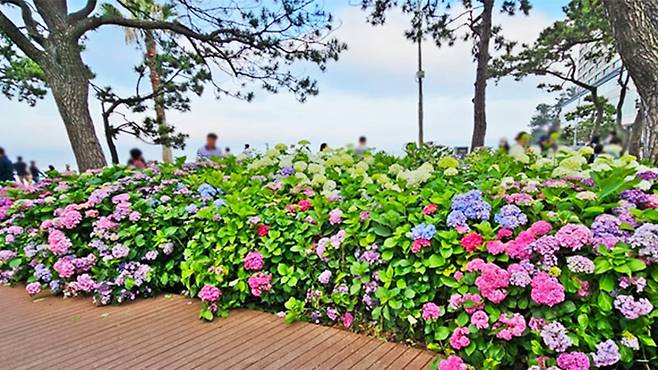 민간단체의 수국 기증으로 조성된 이 공원은 바다와 숲, 꽃이 유기적으로 어우러진 희소한 도심 속 힐링 공간이다.