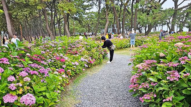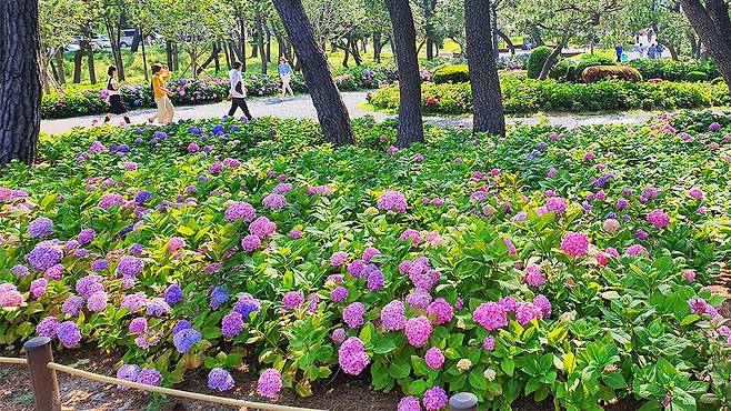민간단체의 수국 기증으로 조성된 이 공원은 바다와 숲, 꽃이 유기적으로 어우러진 희소한 도심 속 힐링 공간이다.