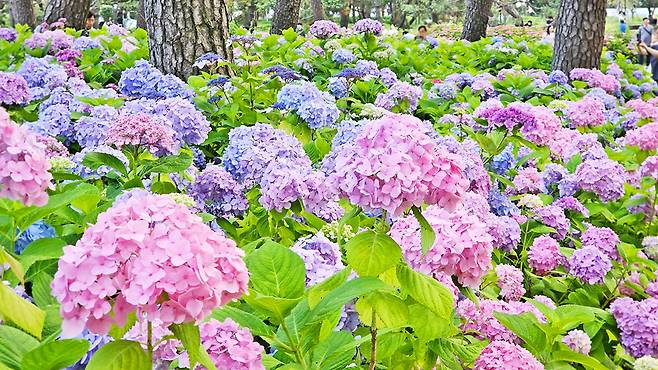보랏빛, 연분홍, 하늘색 등 다채로운 수국들이 무리를 지어 피어나고, 그 사이로 조용히 난 산책로가 이어진다. 그늘진 숲길과 형형색색 꽃이 어우러지며, 공원은 마치 동화 속 정원처럼 느껴진다.
