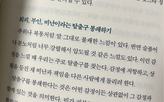 책 『당신의 가능성에 대하여』에서는 이렇게 말한다. “우리는 슬픔이나 분노를 느낄 때 주로 탈출구를 찾는다. 상황을 등진 채 비난과 책임을 다른사람에게 돌린다.” 그러나 감정을 떠넘기면 갈등이 늘고 마음은 더 무거워진다. 감정을 스스로 다룰 줄 아는 사람일수록 나이가 들어도 팔자가 편안해진다.