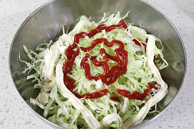 물기 뺀 양배추에 소스를 휘리릭~비비지 말고 살살 섞어야 식감이 살아나요.