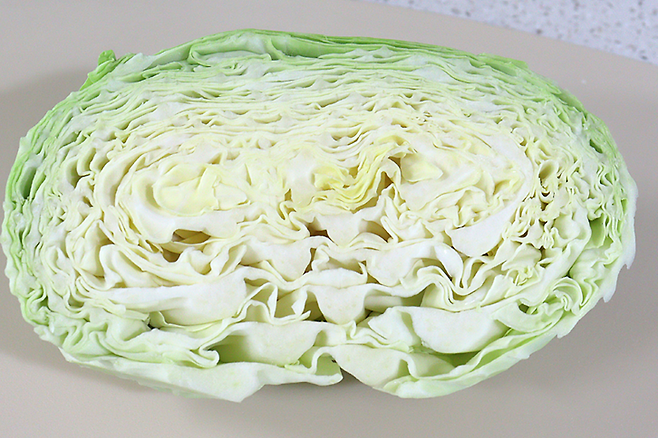 통양배추에서 겉잎 2~3장을 떼어내고 흐르는 물에 가볍게 씻어주세요. 양배추를 최대한 얇고 일정한 두께로 채 썰어줍니다.