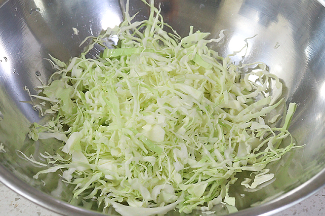 채 썬 양배추를 찬물에 3분 정도 담갔다가 흐르는 물로 1~2회 씻어주세요. 체에 밭쳐 물기를 최대한 빼줍니다.