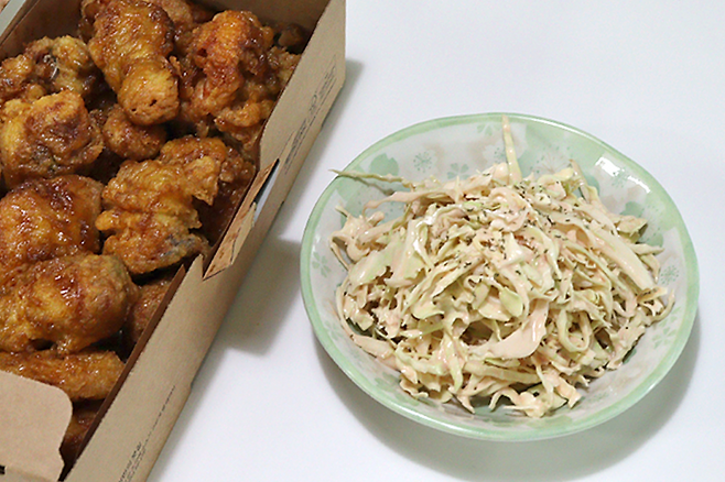 치킨만 먹기엔 느끼하고, 무만 곁들이긴 심심할 때. 바로 떠오르는 그 맛, 옛날 양배추 샐러드인데요.